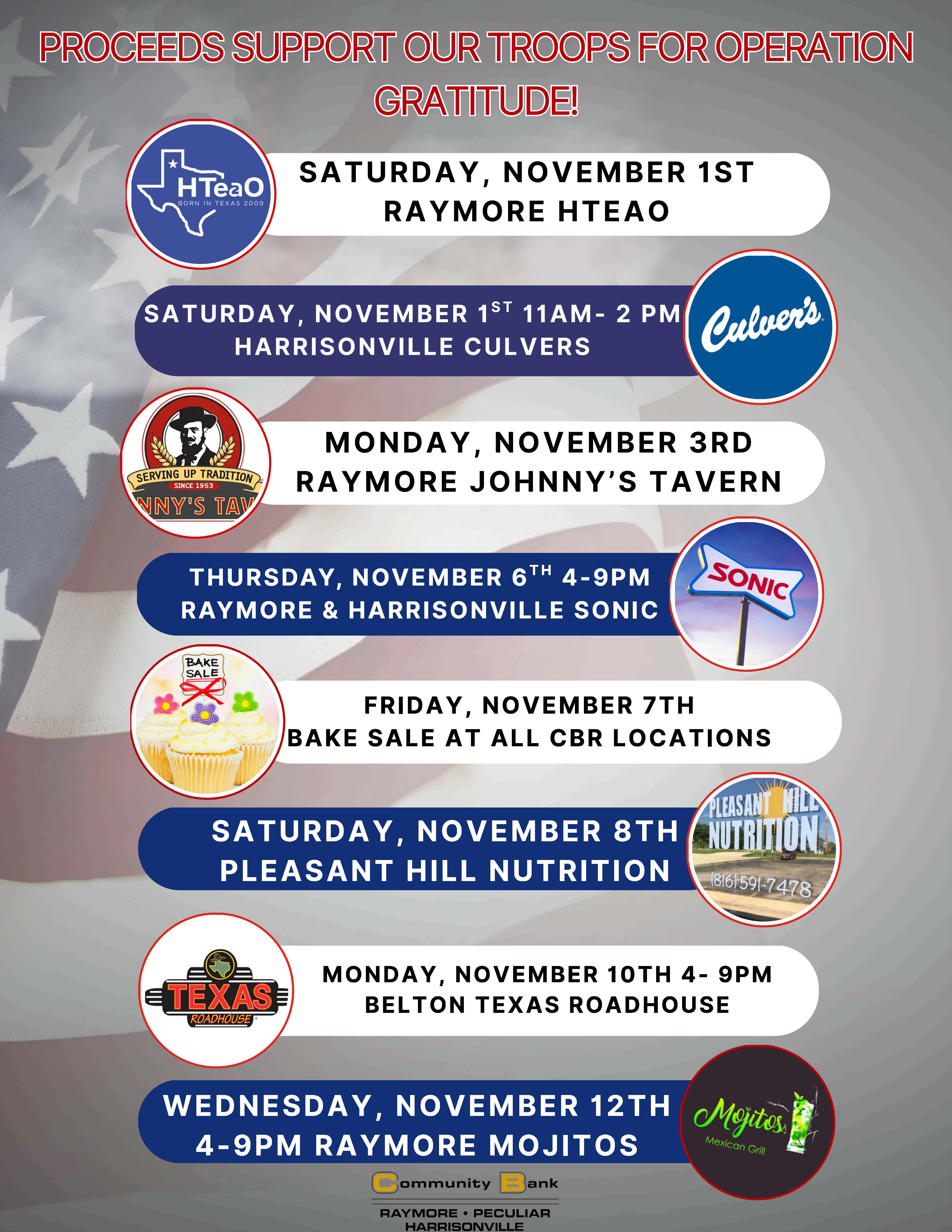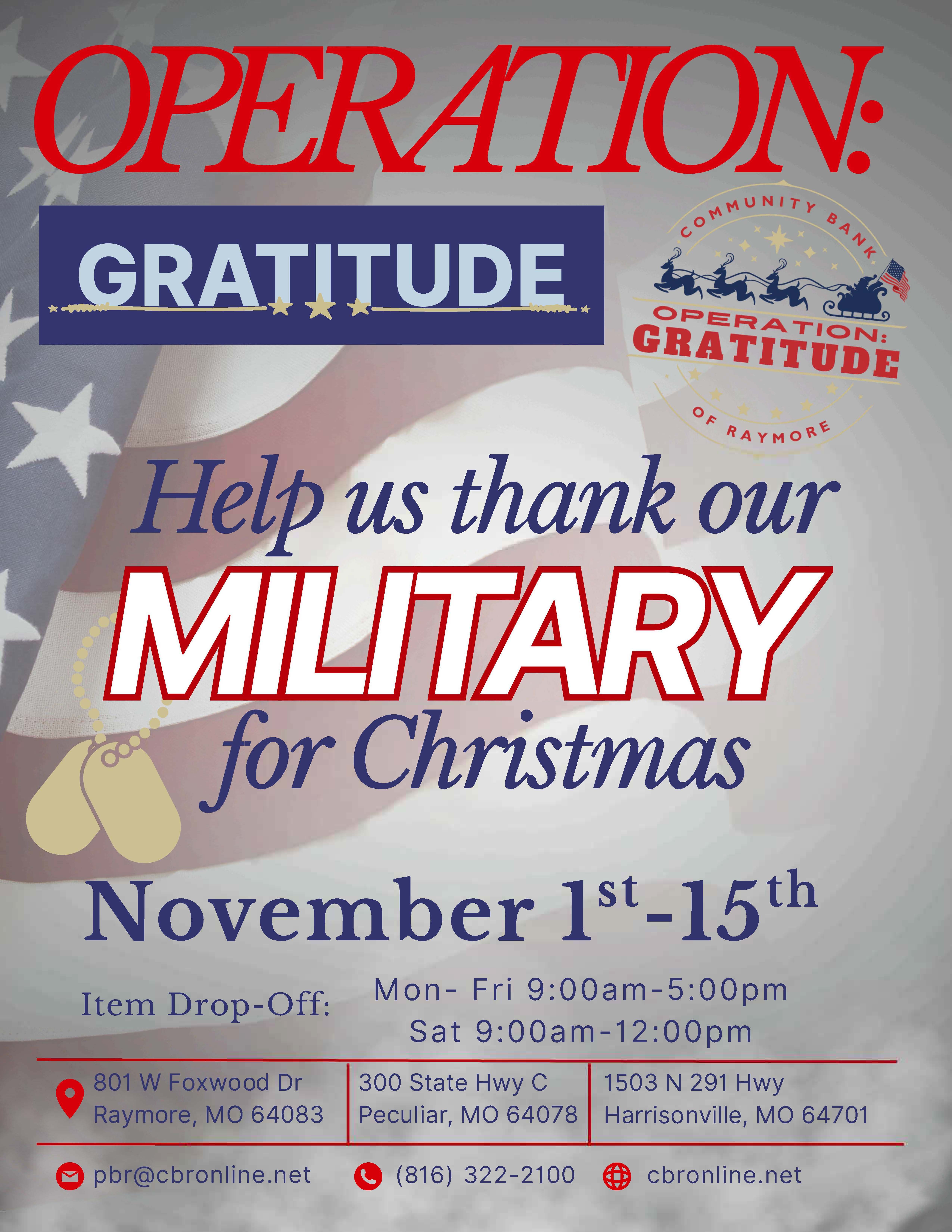 Please join us in kicking off our 7th Annual CBR Operation: Gratitude event! The purpose of this program is to strengthen community bonds as we unite to express gratitude, share holiday cheer, and bring a bit of "Home" to each active-duty service member as they are away from friends and family during this holiday season!